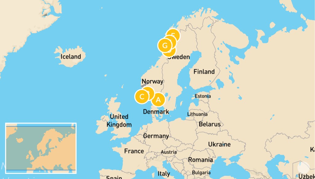 Map of Fjords and Islands Adventure: Oslo, Aurland, Bergen, Vesterålen, Lofoten, & More – 14 Days