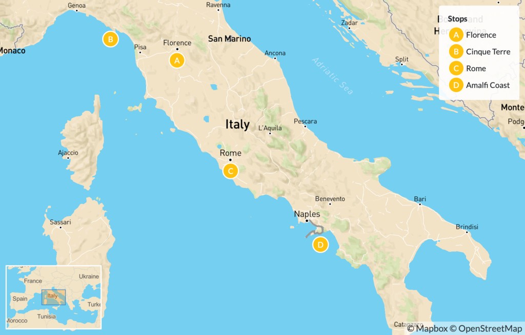 Map of Florence, Cinque Terre, Rome, & Amalfi Coast – 14 Days