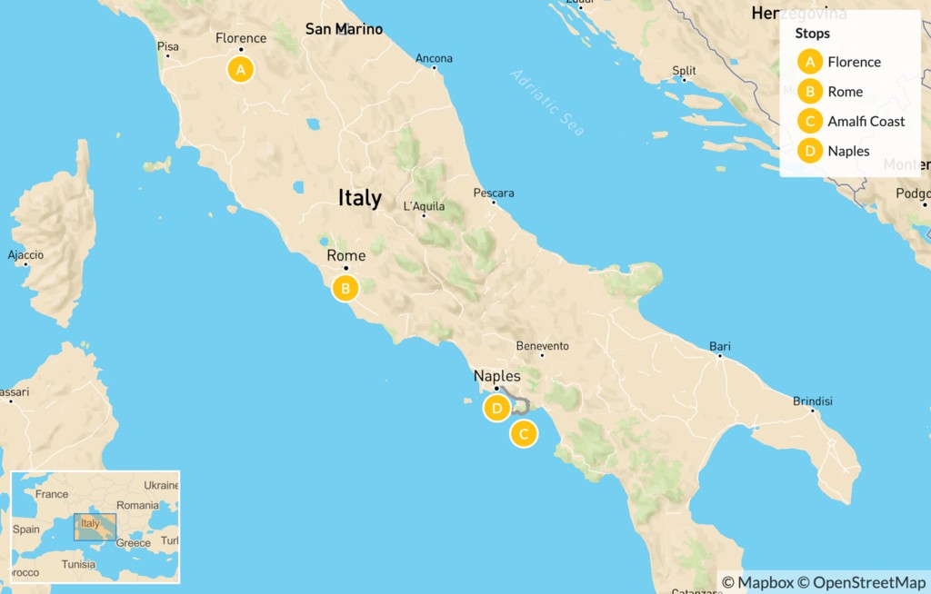 Map of Florence, Rome, & the Amalfi Coast – 10 Days