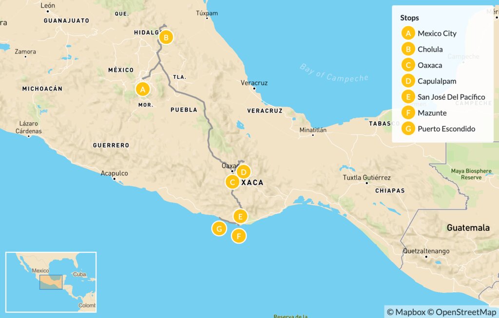 Map of Food, Culture & Adventure in Central Mexico – 12 Days