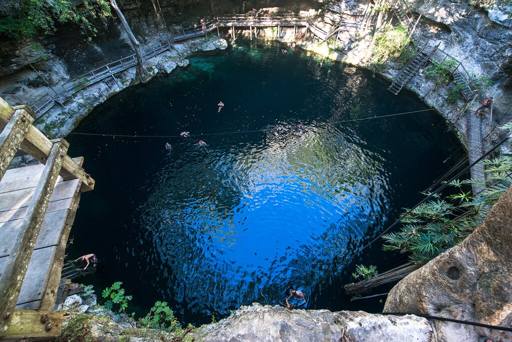 In the morning, you’ll leave Tulum and head northwest into the interior of the Yucatán, stopping at a couple of interesting places along the way. First, you’ll enjoy a guided bicycle tour of the ancient Maya archaeological site in the town of Cobá. As you cycle along the ancient white pathways, you’ll marvel at the ruins of this former metropolis whose heyday was between 600-900 CE. The real highlight is hiking up the 120 stone steps of Nohoch Mul, which, at 137 feet (41 m), is the tallest pyramid in Yucatán. Once at the top, you’ll be rewarded with incredible views of the surrounding jungle.