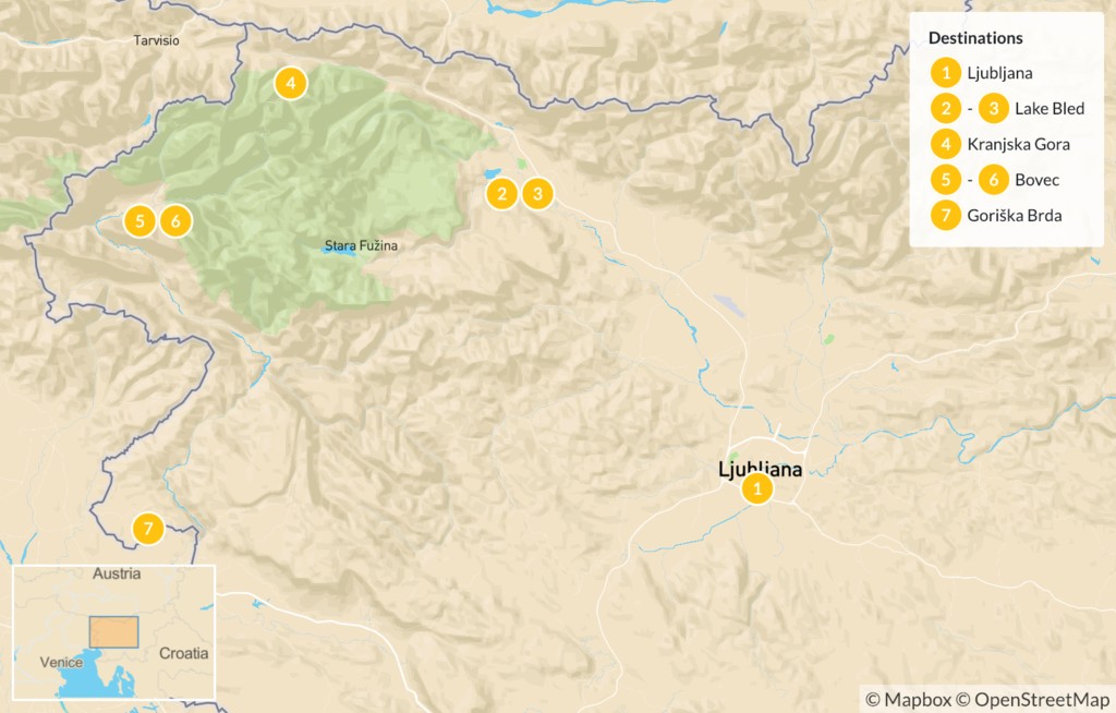 This adventurous itinerary brings you on a thrilling gastronomic and cultural journey through Slovenia’s top regions. Explore Ljubljana’s old town, see Lake Bled’s 11th-century castle, and explore the fairytale-like landscapes of the Soca River Valley. End your trip in Slovenia’s Goriska Brda region, where world-class wines, a Mediterranean vibe, and exceptional farm-to-table cuisine await.