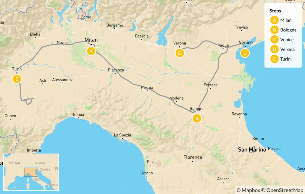 Map of Food & Wine in Bologna, Venice, Verona, Milan & Turin – 13 Days