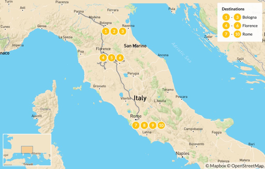 Map of Food & Wine in Italy: Bologna, Florence, Rome – 11 Days