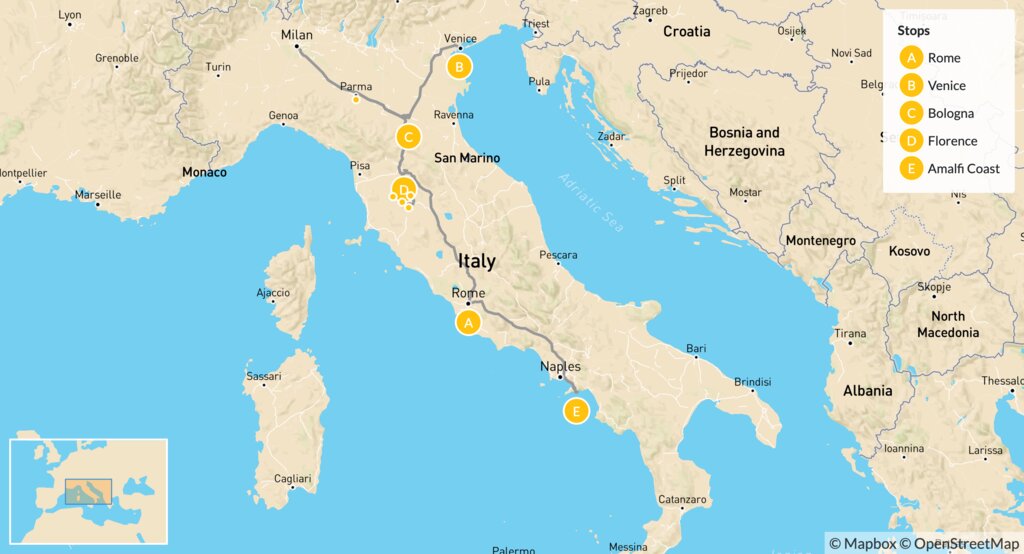 Map of Food & Wine in Italy: Venice, Bologna, Florence, Rome & More – 15 Days