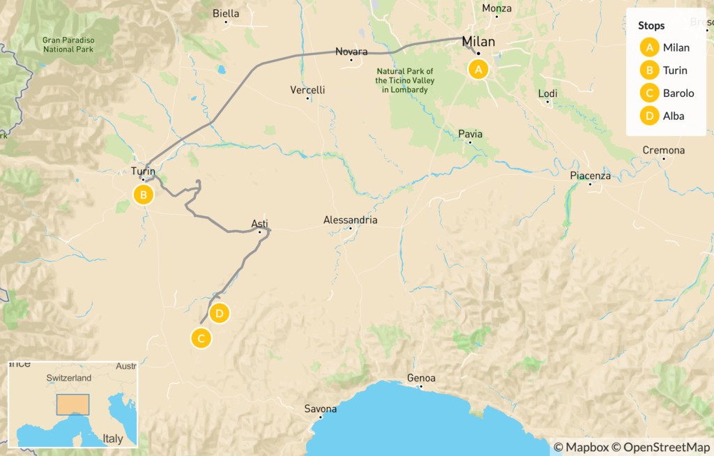 Map of Food & Wine in Piedmont: Turin, Alba, & Barolo – 8 Days