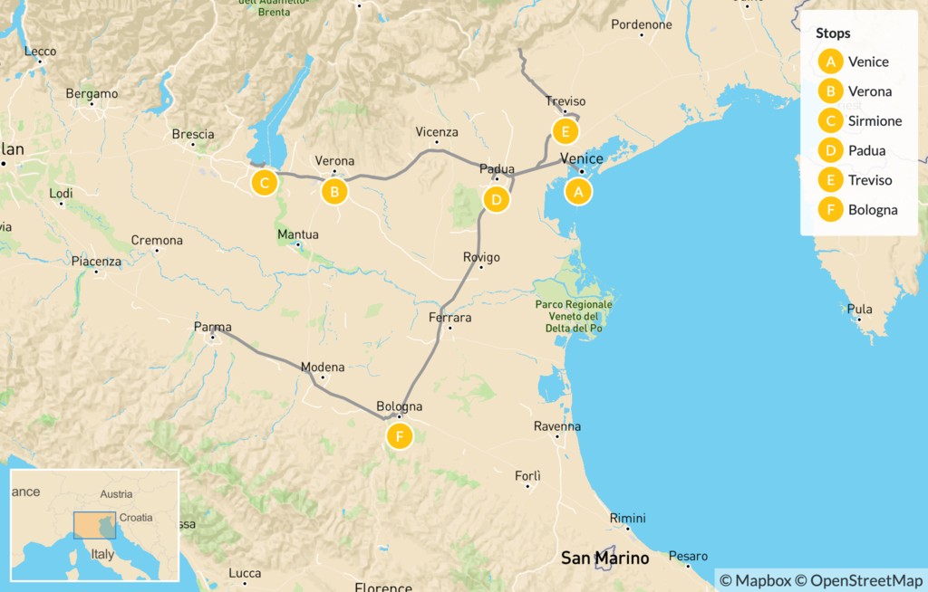 Map of Food & Wine in Verona, Lake Garda, Padua, Treviso & Bologna – 12 Days