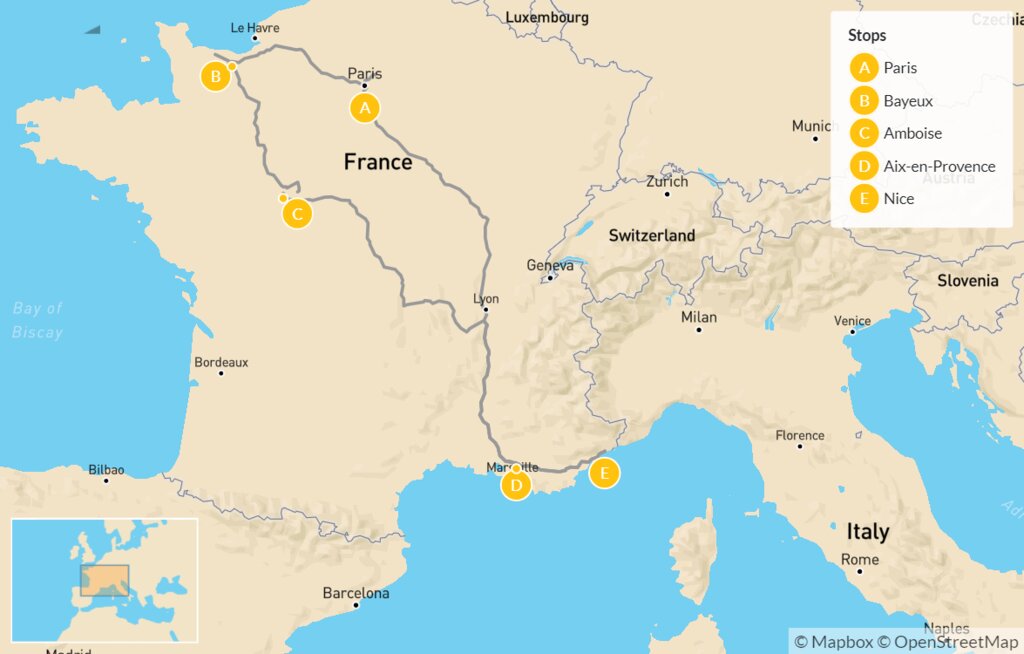 Map of France from North to South: Paris, Normandy, Loire Valley & French Riviera – 14 Days