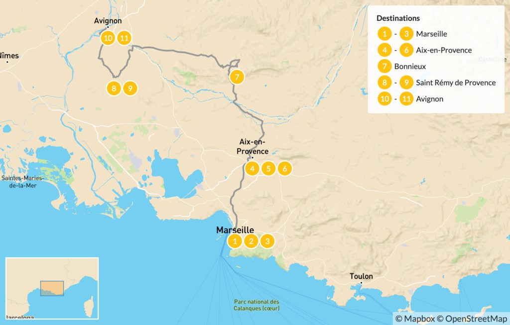 After breakfast, depending on your schedule, you’ll make your way to the airport in Marseille to catch a direct flight or head to the nearest TGV station to board a high-speed train to Paris or Nice. This concludes your grand Provençal adventure. Au revoir!