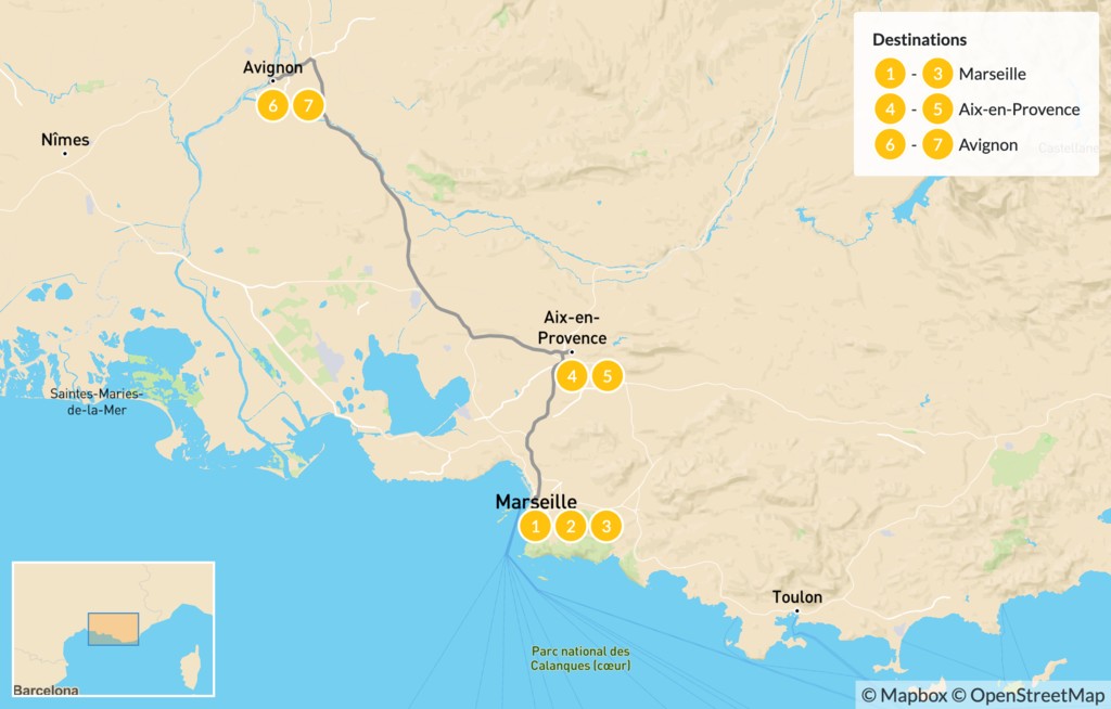 In the morning, pick up your rental car, then transfer from Marseille to Aix-en-Provence, a half-hour drive away. Spend the morning exploring the famous city on a two-hour guided walking tour and uncover the rich heritage, art, and culture that defines the city. Stroll a labyrinth of narrow streets, passing historic churches and squares as your guide points out famous and hidden gems.