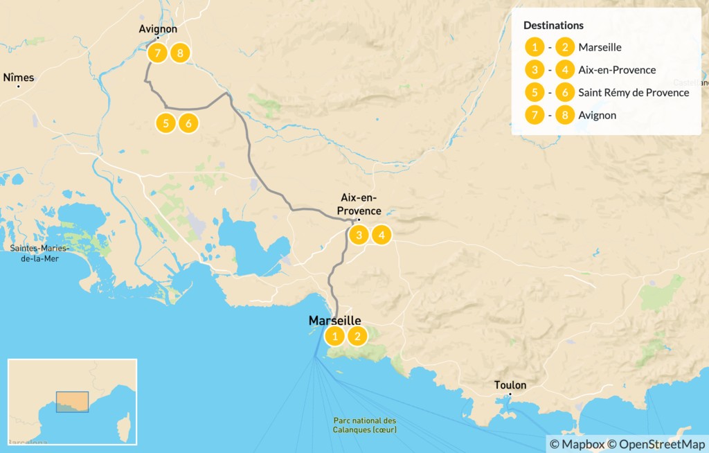 | Day 1 | Arrive in Marseille, Explore | Marseille |