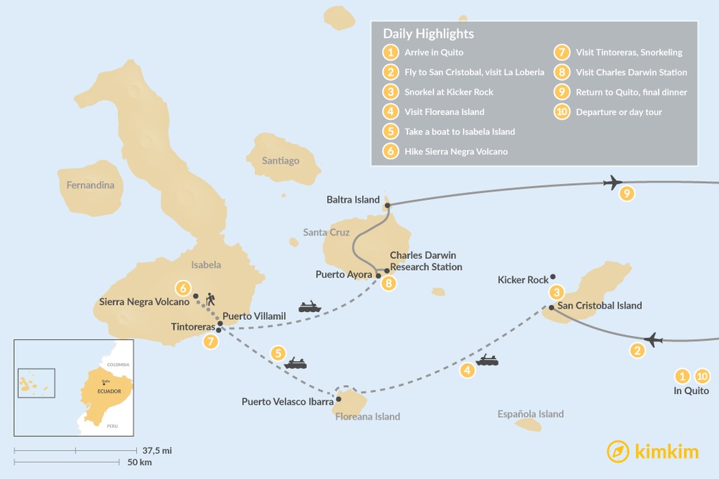 Map of Galápagos Islands Land-Based Adventure Tour: 10 Days