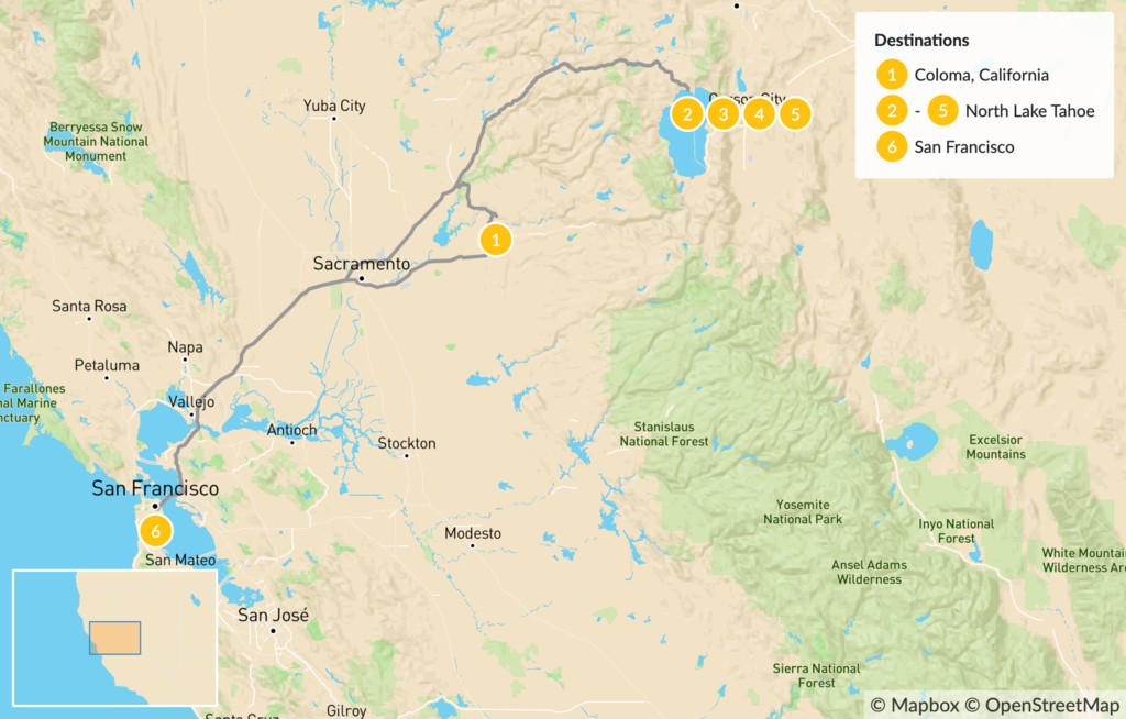 Map of Gold Country, Whitewater Rafting & Lake Tahoe – 6 Days