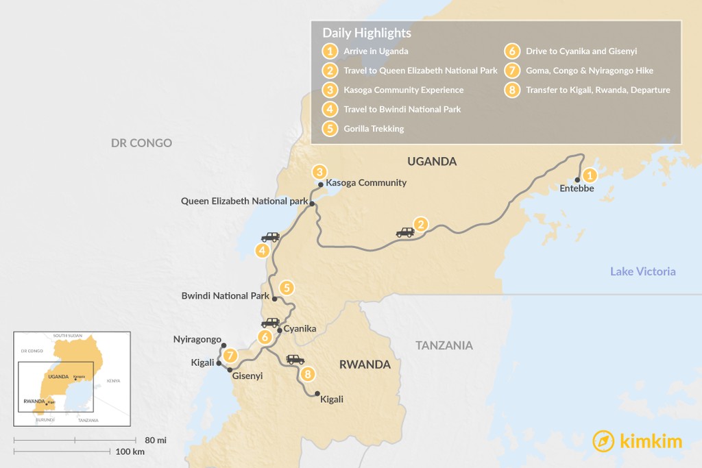 Map of Gorillas in Uganda & Trekking in The Congo – 8 Days