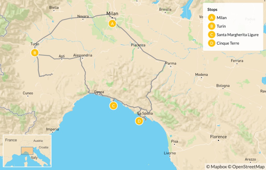 Map of Grand Cities and Classic Riviera Villages: Turin, Santa Margherita Ligure, Cinque Terre, & More – 10 Days