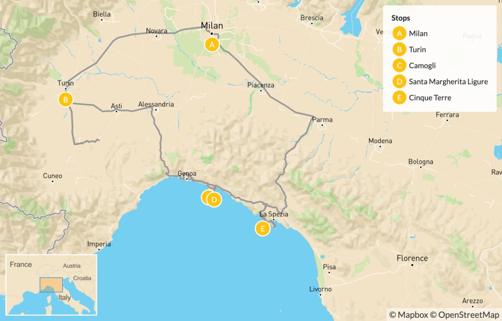 Map of Grand Cities and Classic Riviera Villages: Turin, Santa Margherita Ligure, Cinque Terre, & More – 12 Days