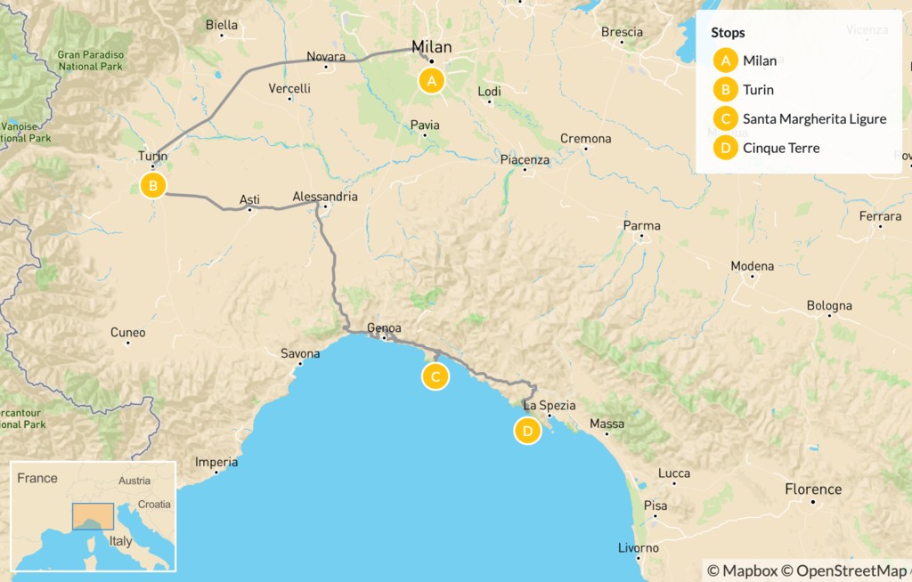 Map of Grand Cities and Classic Riviera Villages: Turin, Santa Margherita Ligure, Cinque Terre, & More – 6 Days