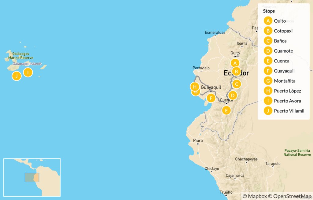 Map of Grand Ecuadorian Adventure: Quito to the Galápagos Islands – 15 Days