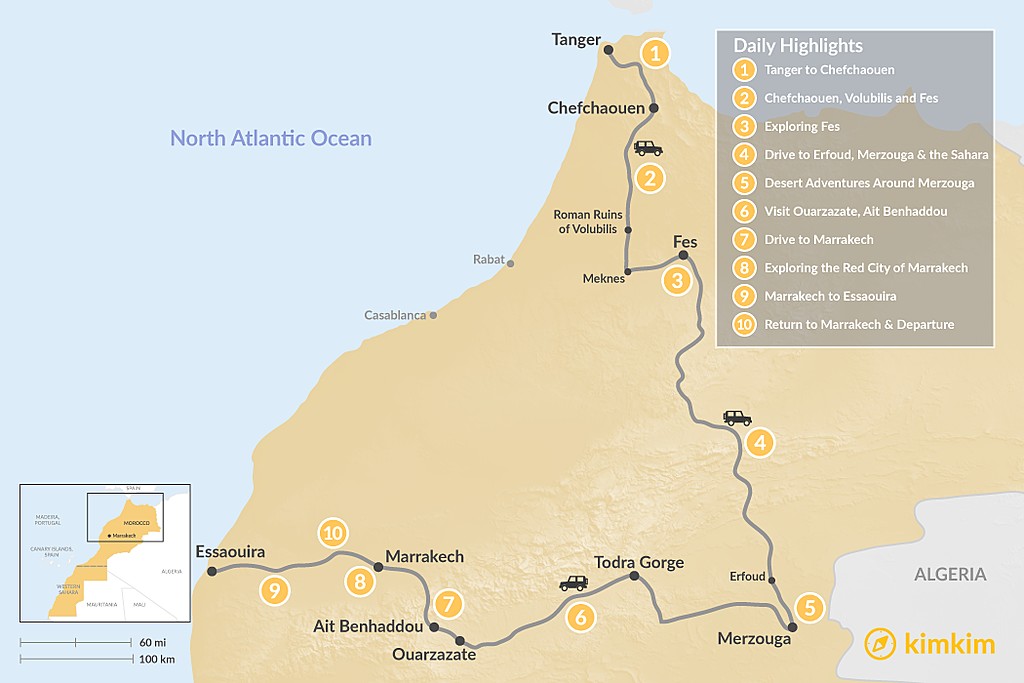 This 10-day itinerary features a perfect mix of culture, history, adventure, and relaxation. Explore imperial cities, mountain villages, desert landscapes, and coastal ramparts. Begin in northern Morocco in Tangier and Chefchaouen before working your way south to Fes, through the desert, and over the Atlas Mountains to Marrakech and Essaouira.
