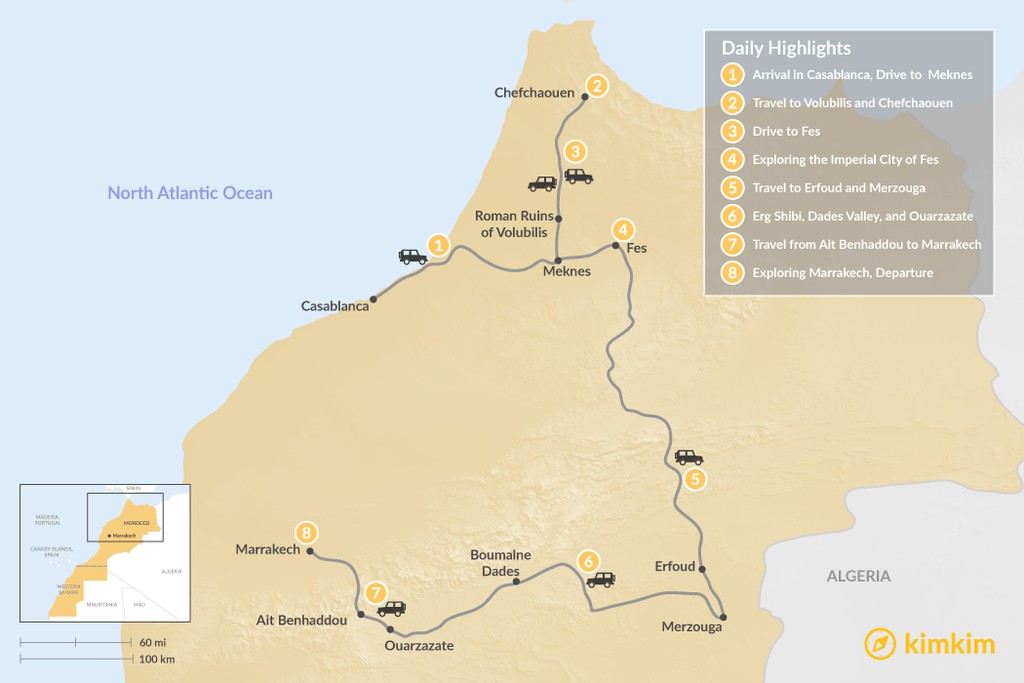 Map of Grand Tour: Casablanca, Meknes, Chefchaouen, Fes, Sahara Desert, Marrakech – 8 Days