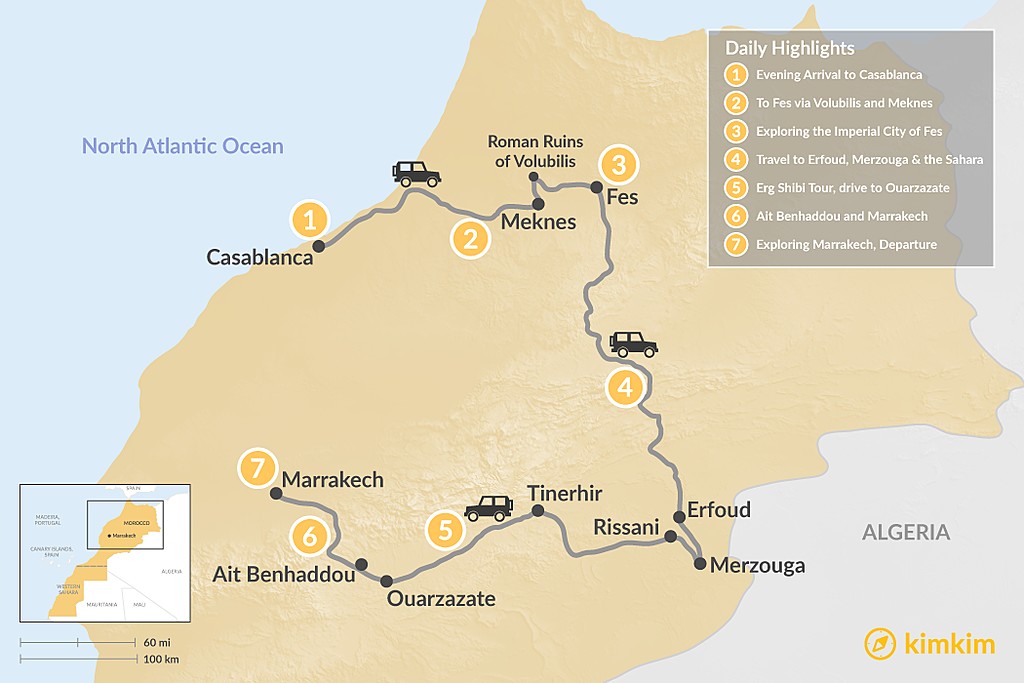 Map of Grand Tour of Morocco: Imperial Cities & the Sahara Desert – 7 Days