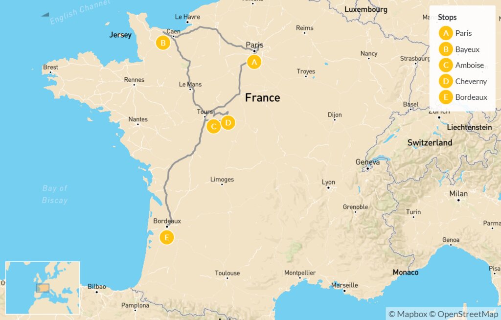 Map of Grand Tour Through Historic France: Paris, Normandy, Loire Valley & Bordeaux – 16 Days