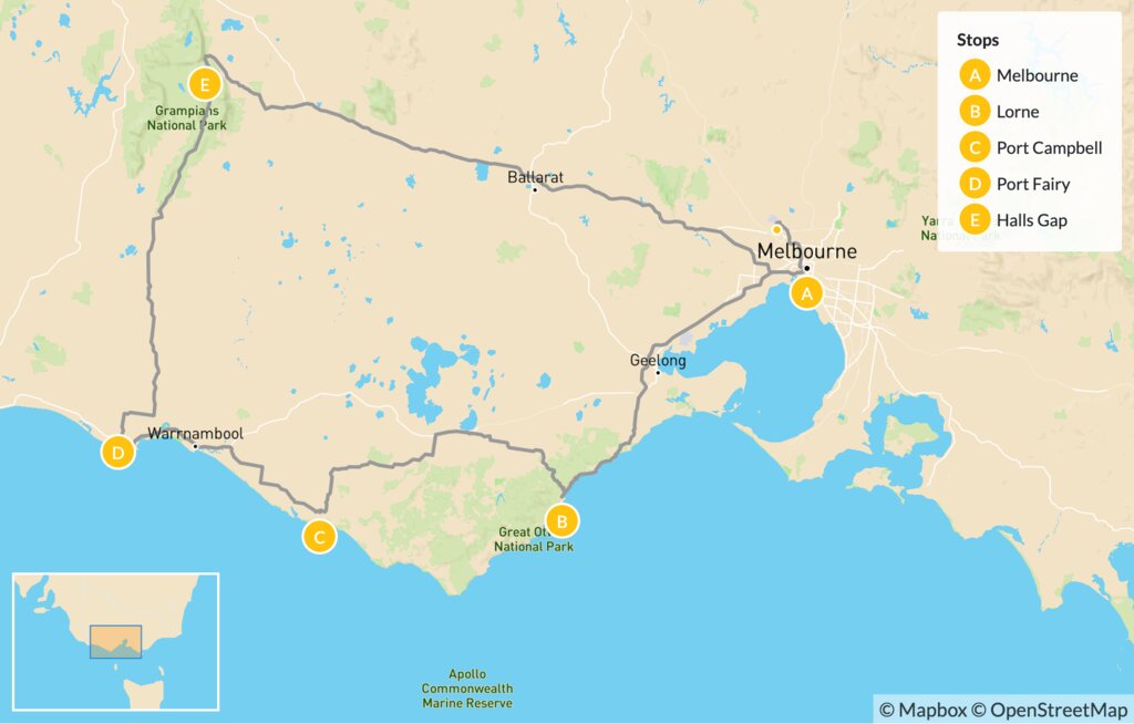 Map of Great Ocean Road, Melbourne & the Grampians – 9 Days