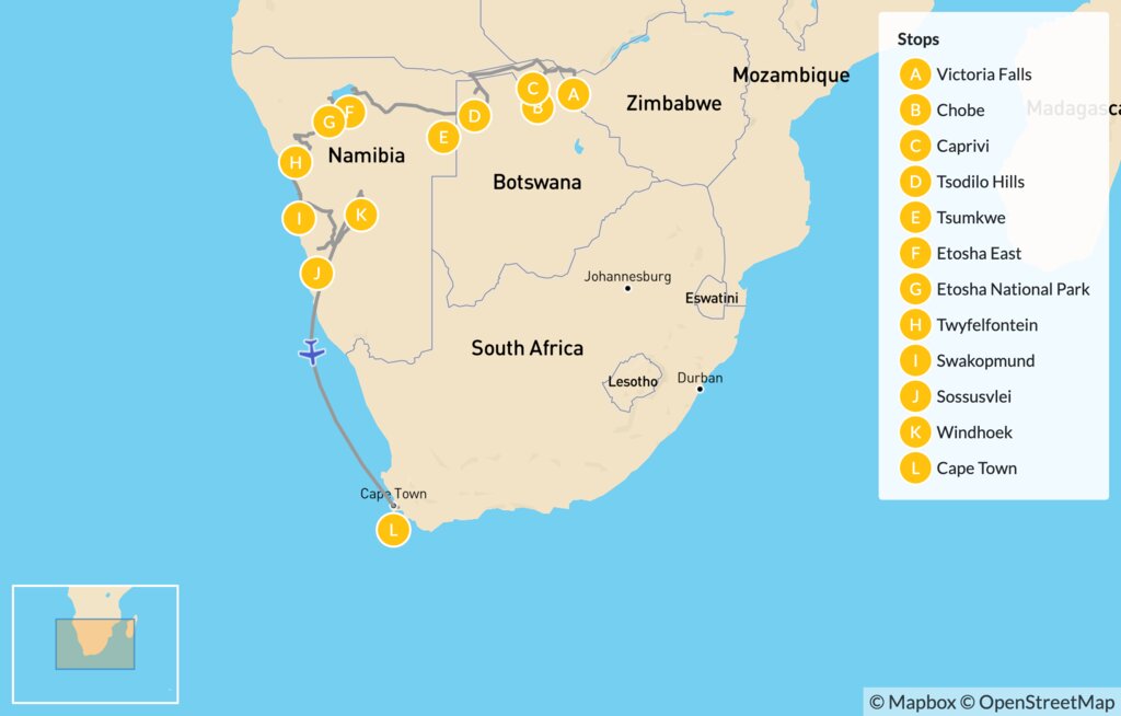 Map of Great Southern Africa Adventure: Zimbabwe, Botswana, Namibia & South Africa- 21 Days