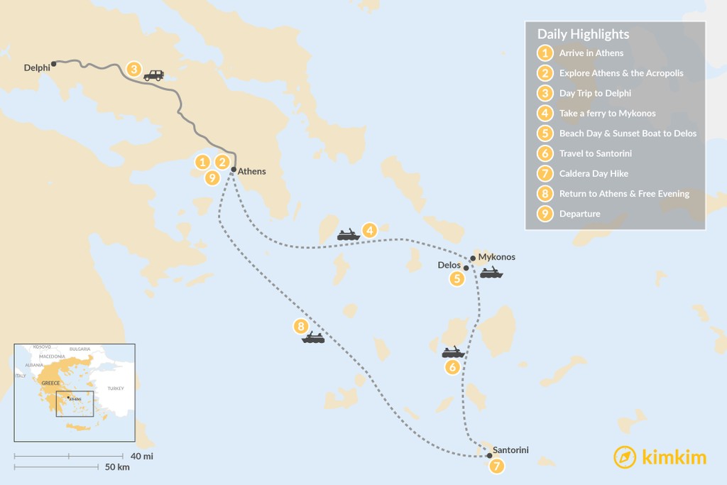 Map of Greek Hotspots in Athens, Mykonos & Santorini – 9 Days