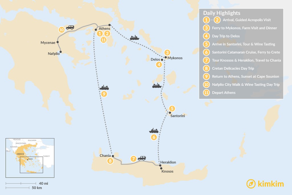 Map of Greek Panorama in Athens, Mainland Greece, Cyclades, and Crete – 11 Days