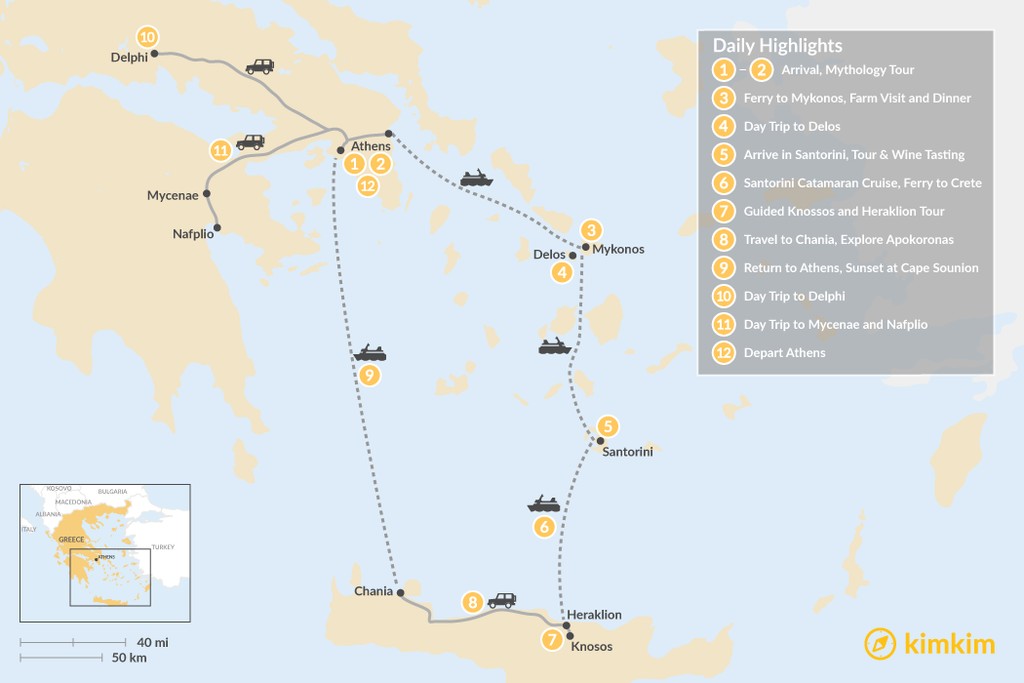 Map of Greek Panorama in Athens, Mainland Greece, The Cyclades, and Crete – 12 Days