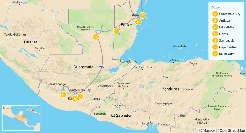 Map of Guatemala & Belize Adventure: Antigua, Lake Atitlan & Caye Caulker – 14 Days