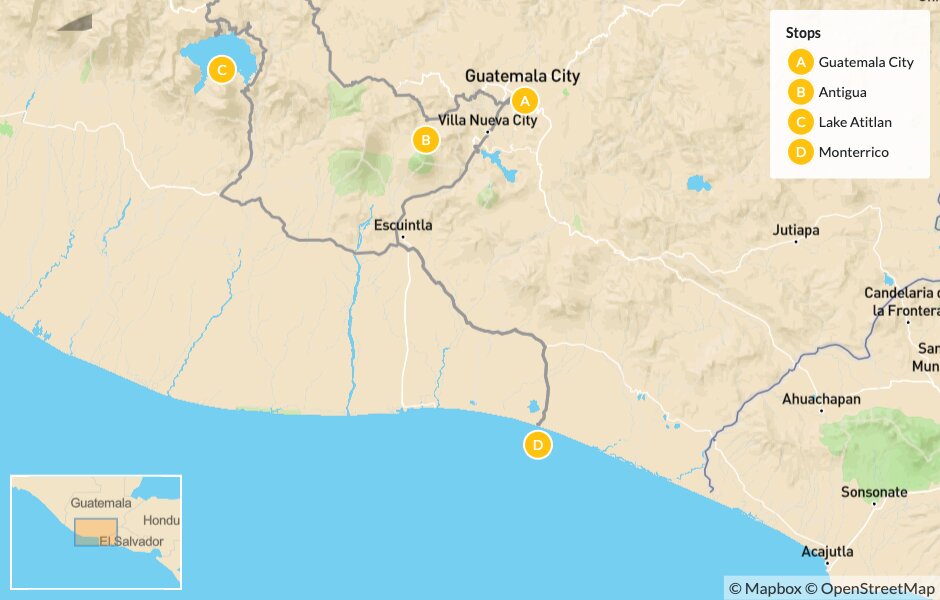 Map of Guatemala Cities, Summits & Coast – 7 Days