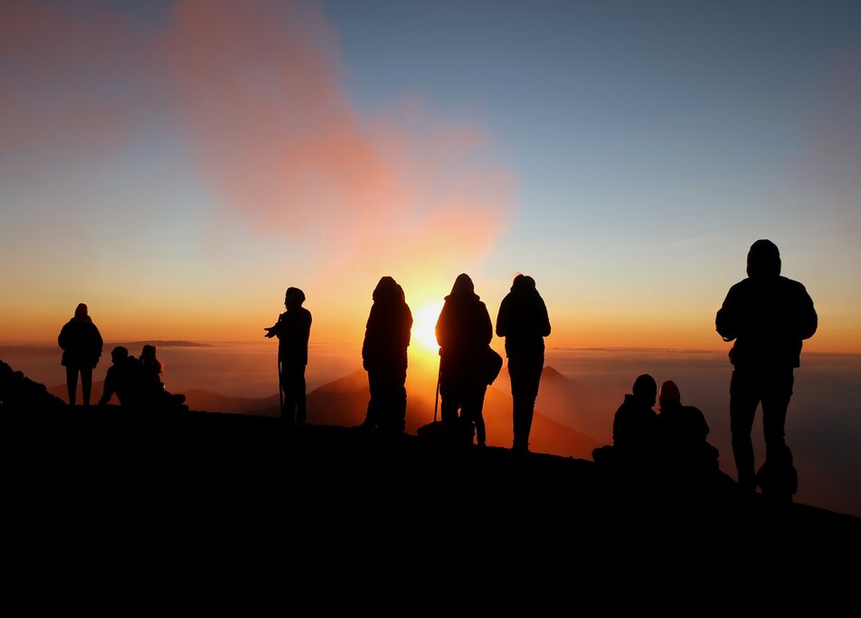 Rise early with your group to see the sunrise over Acatenango. Then start a 45-minute to one-hour trek up a gravel trail through a pine forest. Brace yourself for the steepest section of your hike, leading to the rocky, windy summit of Acatenango’s peak.