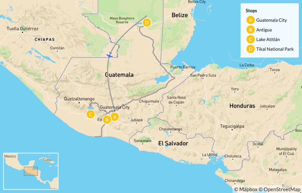 Map of Guatemala Culture & Adventure Tour – 8 Days