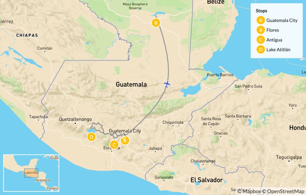 Map of Guatemala Culture Tour for Families: Flores, Antigua & Lake Atitlán – 10 Days
