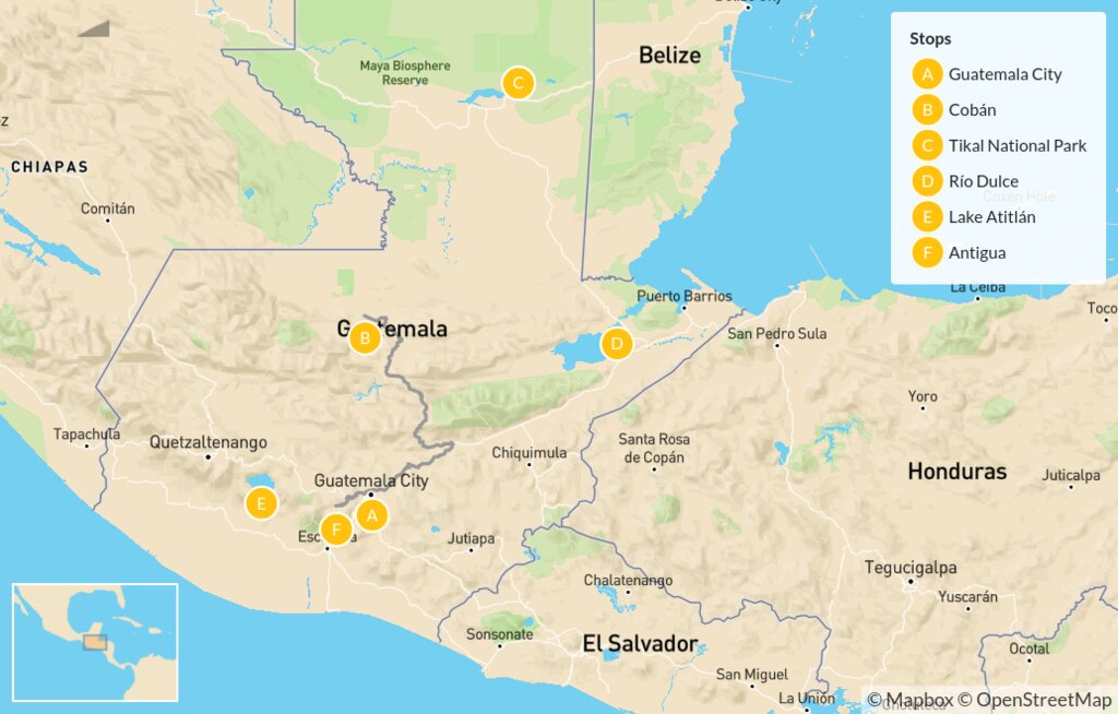 Map of Guatemalan Culture & Outdoors: Tikal, Antigua & More – 10 Days
