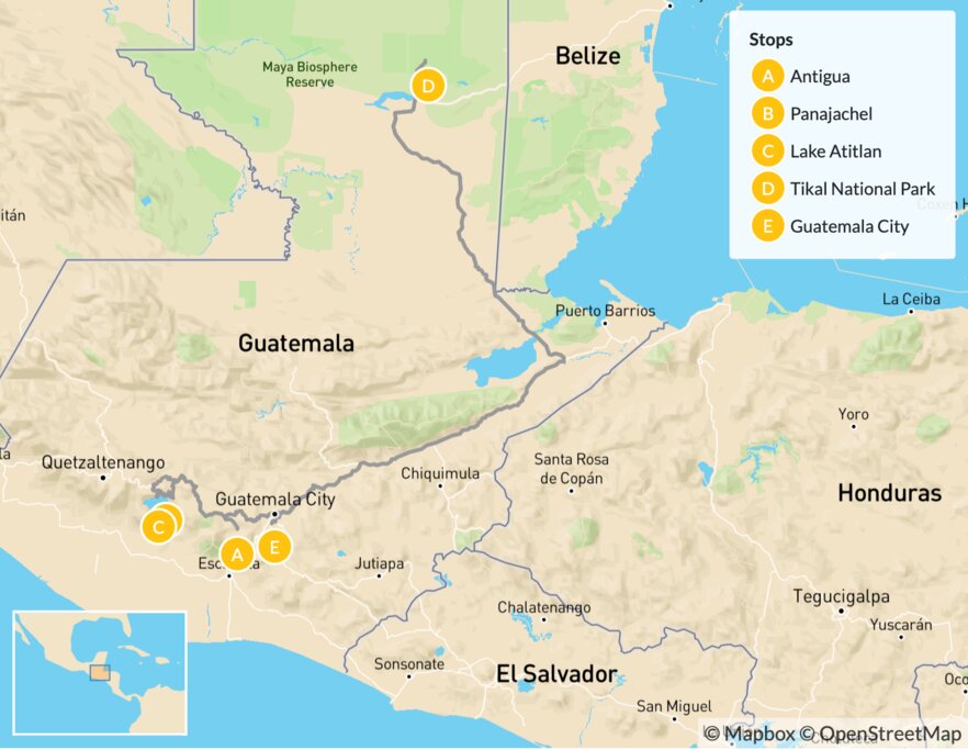 Map of Guatemalan Highlands: Antigua, Lake Atitlán & Tikal – 7 Days