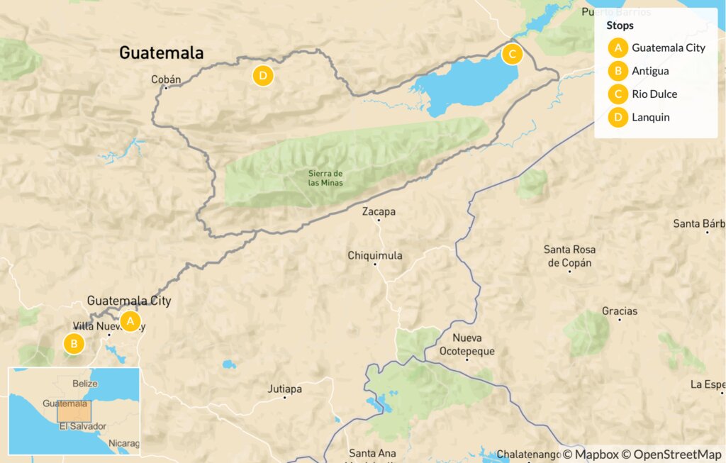 Map of Guatemala’s Maya Ruins, Hot Springs & Waterfalls – 6 Days