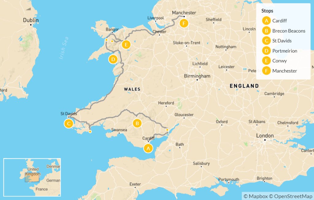 Map of Guided Drive of Wales: Brecon Beacons, St Davids, Portmeirion, Conwy & Manchester – 7 Days