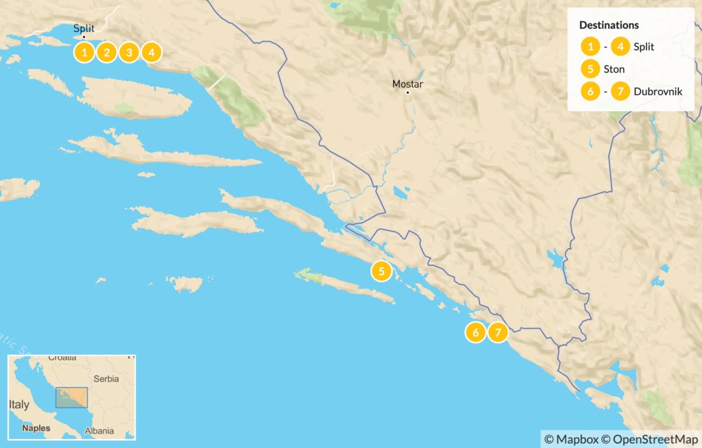 Map of Hidden Gems of Dalmatia: Trogir, Šibenik, Pelješac, & Cavtat – 8 Days