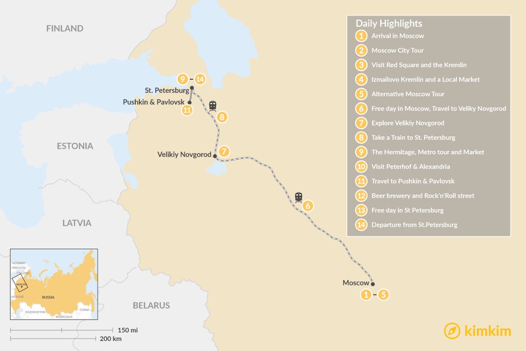 Map of Hidden Gems of Moscow, Veliky Novgorod, and St. Petersburg – 14 Days