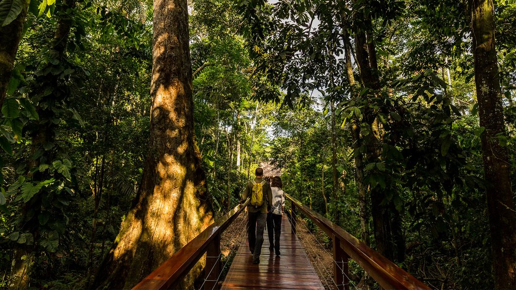 Along the way, stop at El Chuncho Claylick, where you’ll spot dozens of macaws feeding on the sodium-rich riverbank clays. Continue to the TRC, where you’ll check in and receive a briefing about the lodge and its activities, from hikes to cruises and bird-watching trips. Get your first glimpse of the lodge’s elevated rainforest walkways on your way to dinner.