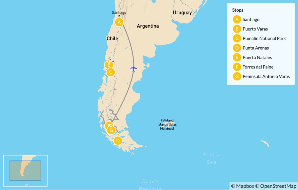Map of Hidden Wonders of Chilean Patagonia – 16 Days