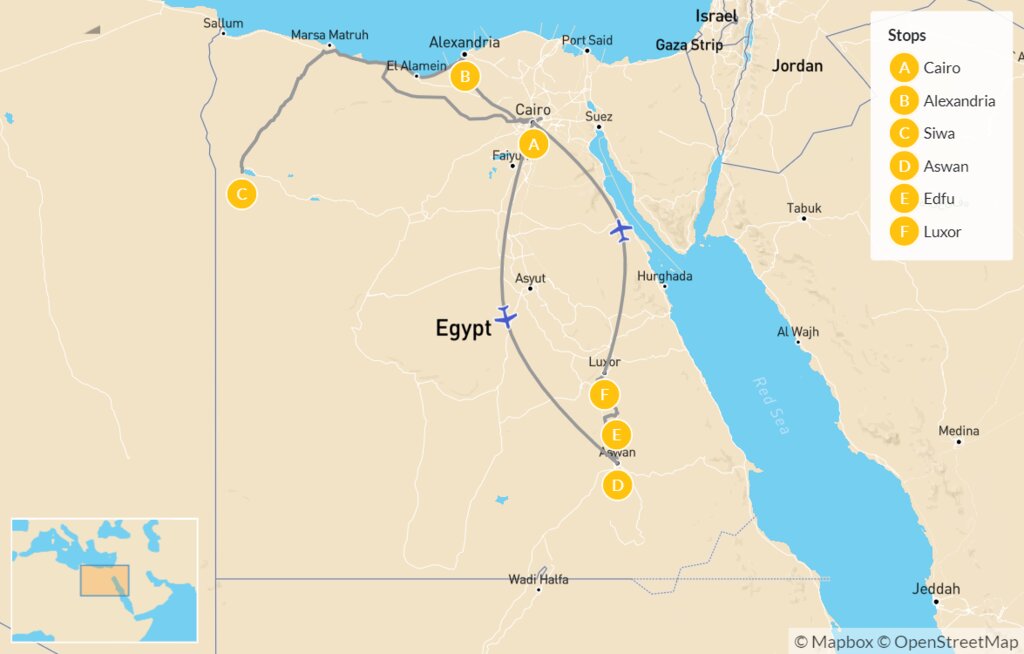 Map of Highlights & Hidden Treasures of Egypt: Cairo, Alexandria, Siwa, Aswan & Luxor – 13 Days