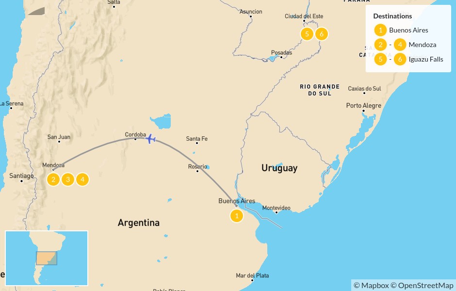 Map of Highlights of Argentina: Buenos Aires, Mendoza & Iguazu Falls – 7 Days
