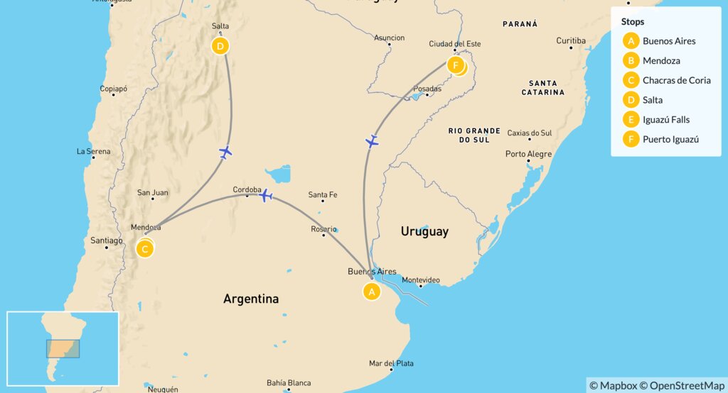 Map of Highlights of Argentina: Buenos Aires, Mendoza, Salta & Iguazú – 14 Days