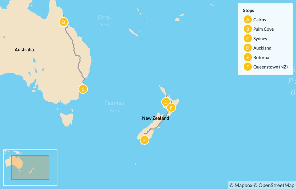 Map of Highlights of Australia & New Zealand: Palm Cove, Sydney, Auckland & Queenstown – 15 Days