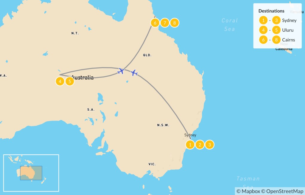 Map of Highlights of Australia: Sydney, Uluru & Cairns – 9 Days