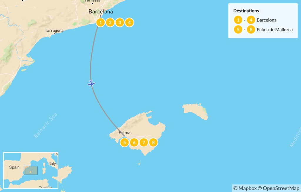 Map of Highlights of Barcelona & Mallorca: Cities, Beaches & Mountains – 9 Days